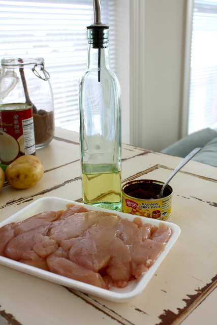 1 – Corta el pollo en trocitos de tamaño mordisco, échale un poco de aceite y la cantidad de pasta de curry massaman que quieras. En general, y habiendo visto la habilidad del español medio para tolerar el picante, yo empezaría con una cucharada no muy llena. Lo mezclamos todo y lo dejamos marinar. También hay recetas para preparar la pasta de massaman, pero es mucho trabajo y la que viene hecha está buenísima.