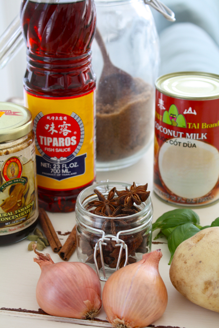 2 – Reunimos los ingredientes necesarios para preparar lo demás. Necesitaremos las cebollas, las patatas, la albahaca, la leche de coco, el azúcar moreno, la salsa de pescado, la pasta de tamarindo, las especias y los cacahuetes