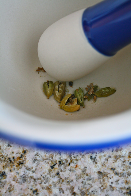 4 - Calentamos algo de aceite en una olla lo suficientemente grande para que quepa todo. Recomiendo encarecidamente meterle un par de apretones al cardamomo, ya sea con el mango del cuchillo o con un mortero. No nos interesa que el cardamomo explote dentro de la olla con el aceite caliente y nos salpique.