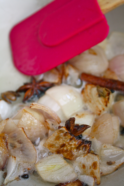 Una vez que se haya calentado el aceite, metemos las especias dentro. Las freímos durante medio minuto. Justo después, añadimos la cebolla a las especias. Las freímos a fuego medio-alto hasta que estén empezando a transparentar.