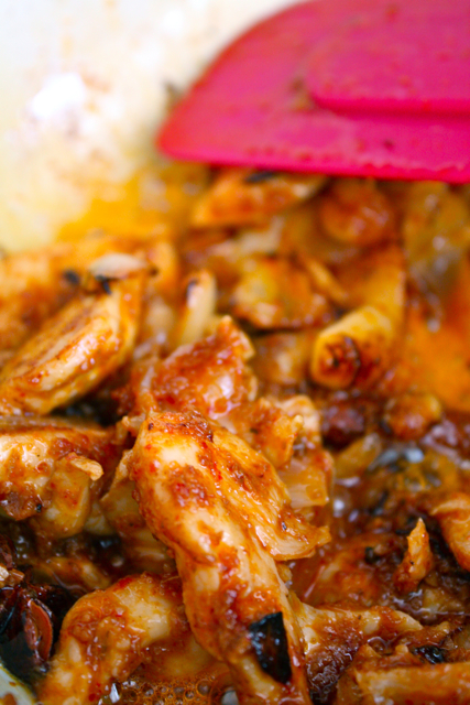 11 – Apagamos el fuego. Añadimos la pasta de tamarindo, el azúcar moreno y lo que nos queda de albahaca fresca. Removemos para que se deshaga la pasta de tamarindo y el azúcar, y lo probamos. Te recomiendo que te sientes antes de probarlo. A mí me flaquearon las rodillas cuando lo hice. No es coña. No hay palabras que puedan definir el placer que da comer este plato.