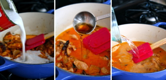 6 – Añadimos la leche de coco, la salsa de pescado y el agua. Removemos todo para que no se pegue y para que se mezcle con la leche de coco.